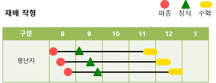 일반 평난지에서 8월 파종하여 11월 하순~12월 중심으로 수확 가능합니다.