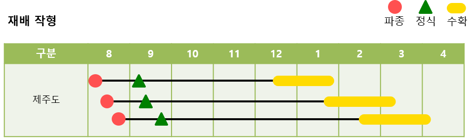 제주도에서는 8월상순~중하순까지 파종하여, 12월중순~3월까지 수확이 가능합니다.